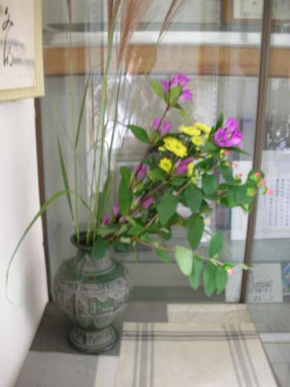 玄関のケースに入っている生け花です。地域の方が定期的に活けてくださいます。この時期にふさわしいお花が活けられています。菊の花やすすきは、秋の代表的な花ですね。ぜひ、ゆっくりと鑑賞してほしいものですね。