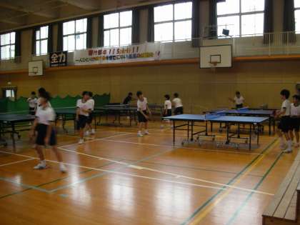 体育館では、卓球部が舞台側で練習をしています。通常とは逆のコートです。なぜかと聞くと、「六稜祭のために舞台前に階段が出ているので、バレーボール部の練習には危険だから」と、言うことです。確かに卓球部の練習は十分できるスペースがありますね。