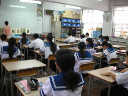 気温が落ち着いてきたので、美術室で行っています。1年生は、表札づくりを行うそうです。材料を配布され、説明を聞いているところです。