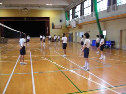 3年生女子は、体育館でバレーボールの授業を受けています。試合形式での様々なルールや約束事を学んでいます。6人制バレーボールのローテーションやポジショニング(位置取り)の説明を受け、実際にプレーの中でも実践しようとしています。素晴らしい!