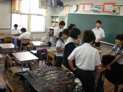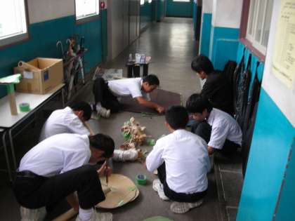 劇のせりふを合わせているグループ、大道具のグループ、衣装を作るグループ、背景画を作成しているグループ等。