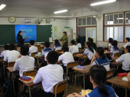 英語の授業の様子です。C’Net の先生とのチームティーチングです。電話での会話をしている様子です。生徒たちはその会話を聞いて、何を言っているのかを理解しようとしています。