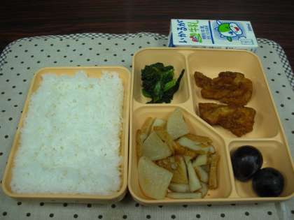 本日は、鶏肉の竜田揚げ、赤平天とだいこんの煮物、ホウレン草のおひたし、ぶどう(ピオーネ)です。