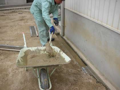 2人の管理作業員さんが持ち場を決めて、側溝の両サイドから、清掃をしています。側溝にたまった土を一輪車に移しています。