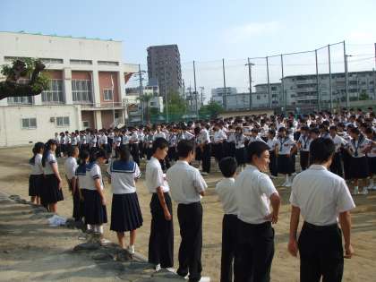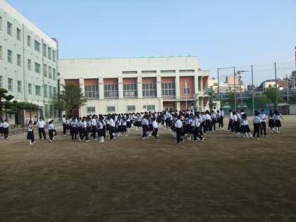 久しぶりの全校集会です。生徒たちも5分前行動を心掛けて、グラウンドに駆け足で出てきます。