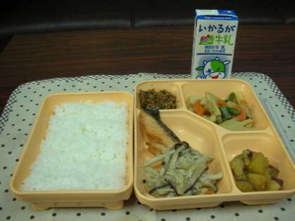 本日の給食は、鮭のきのこあんかけ、鶏肉と野菜の炒め煮、サツマイモの甘煮、おかか菜っ葉でした。