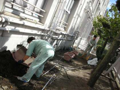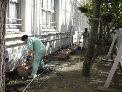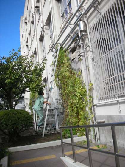 管理作業員さんが、南館のゴーヤでできた『グリーンカーテン』の撤去作業をしてくださいました。夏には、強い日差しを遮り、室内の温度を少し下げてくれる働きがありました。逆にこの季節になると、ゴーヤも葉が黄色に色づき、枯れ始めています。太陽の陽ざしが恋しくなるこの時期に、ゴーヤを撤去したのです。ありがとうございました。
