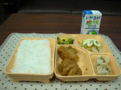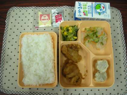 本日は、油淋鶏、春雨サラダ、シューマイ、チンゲンサイとコーンの炒め物です。このおかずは、生徒にとっては、食べやすく喜ばれるものだと思います。油淋鶏とシューマイは、生徒に好まれるおかずです。シューマイには濃い口しょうゆを、春雨サラダにはマヨネーズをかけていただきます。
