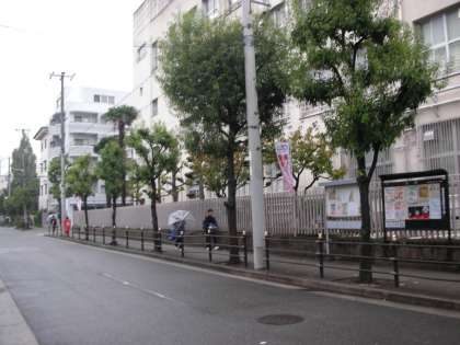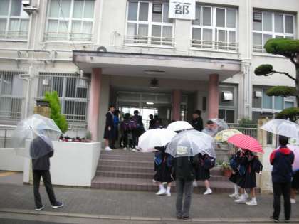 雨が降っているので、生徒たちは傘をさしての登校です。傘の分だけ荷物が多くなってしまいます。