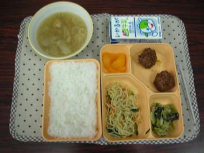 あとのおかずは、肉団子、ツナとホウレンソウのオイスターソース炒め、みかん缶詰でした。