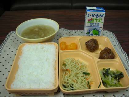 本日は、ちゃんぽんです。ちゃんぽんのスープにおかずの容器に入っている炒め麺を入れていただきます。スープは温かいのですが、冷やされた面を入れるので、結局は冷めたちゃんぽん麺ができるのです。このことにより、味がかなり落ちてしまいます。残念です。しかし、スープのおかわりをしている人もたくさんいました。