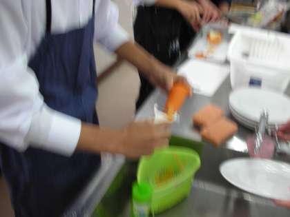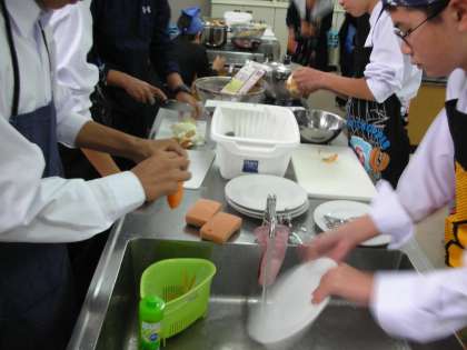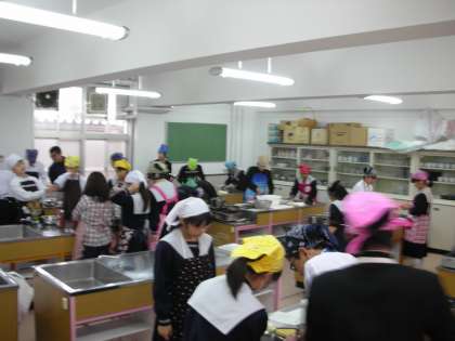 調理実習です。ミートスパゲッティを調理します。全員がエプロンを身に着け、頭には三角巾を着けています。