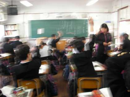 先生の質問に対して、わかった人が挙手しています。正解したら、シールを補助教材のプリントに張ってもらえます。生徒たちは、「自分の答えを聞いてください!」という願いを込めて手を挙げています。