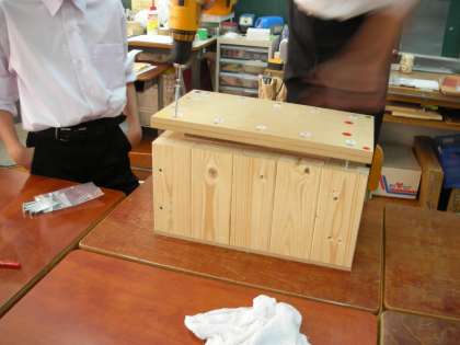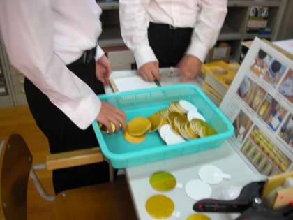 2名の生徒が作業学習をしています。行事の参加賞として、生徒に贈呈する手作りのメダルです。