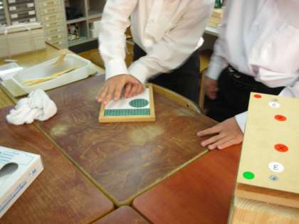 厚紙を円形に切り取り、所定の厚さになるように糊付けし、色紙を張り、圧力をかけます。