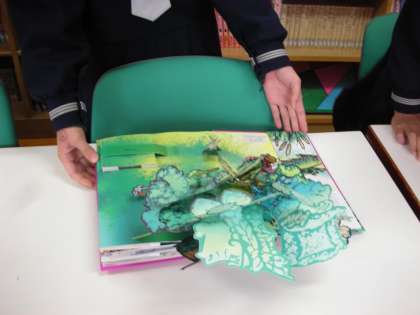 飛び出す絵本を見て、楽しそうに読んでいる人がいました。