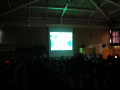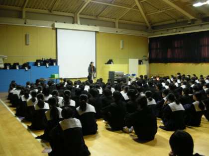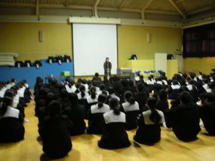 この日は、格技室で全体説明が行われました。一般的な説明の後に、文部科学省作成のDVDを見て学びました。