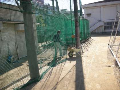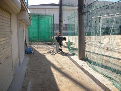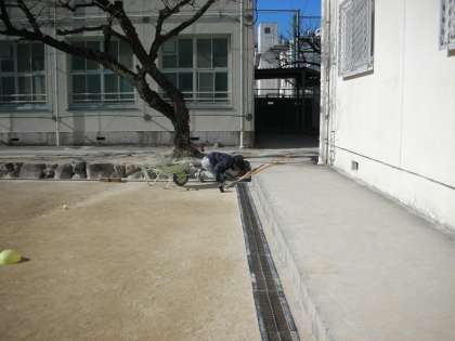 今は、側溝の清掃をしています。雨が降った後、グラウンドから側溝に多量の土が流れ込みます。これをシャベルと一輪車を使って、側溝の土を取り除いています。この作業は、結構身体にこたえます。足腰に大きな負担がかかります。安全に気を付けて作業をしています。このおかげで、雨が降っても、グラウンドの水たまりがすぐになくなるのです。