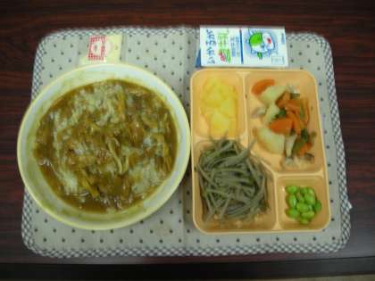 本日は、カレーどんぶり、鶏肉とじゃがいもの煮物、ごぼうサラダ、パインアップル缶詰でした。