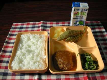 おろしハンバーグ、ししゃもの磯辺フリッター、水菜のおひたし、りんご缶詰でした。