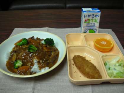 昨日は、ハヤシライス、白身魚フライ、コールスローサラダ、みかんでした。