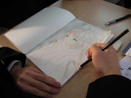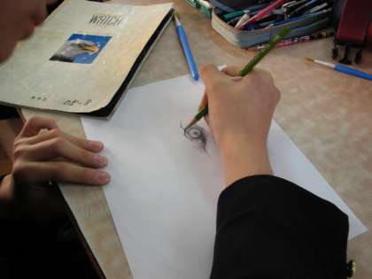 美術部は、美術室で活動しています。3年生は実技テストに向けて、先生の指導を受けています。1,2年生も頑張っています。