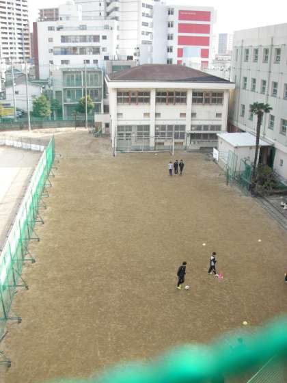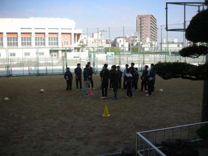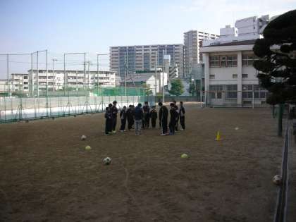 グラウンド(工事中なので、狭いのですが)では、サッカー部がミーティングを行っています。今日の練習の確認を行っています。練習が始まると大きな声でプレーしています。