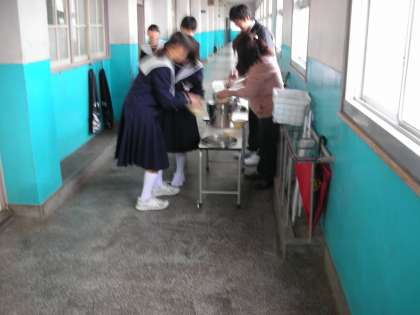 廊下では、みぞれ汁を先生がよそっています。