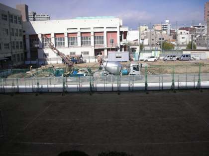 コンクリートミキサー車がトラックの装置にコンクリートを流し込んでいます。さきほどの太いホースは、仮設校舎の基礎部分にセメントを流し込むためのものだったのです。