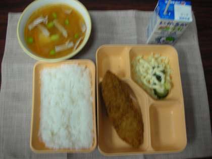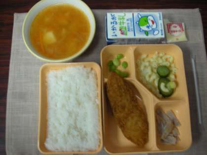 本日の給食は、ミネストローネ、白身魚フライ、マカロニサラダでした。
