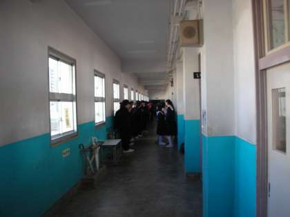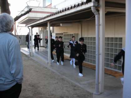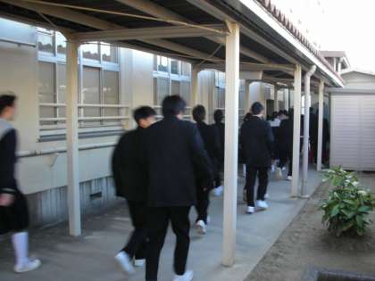 消防署の方のお話を聞いた後、今度は、津波がやってくる想定のもと、避難を行いました。4階に教室がある1年生は、まっすぐ自分の教室に避難しました。2年生1組〜3組も自分の教室に避難しました。3年生は、4階の廊下に避難しました。2年4組も4階の廊下に避難しました。