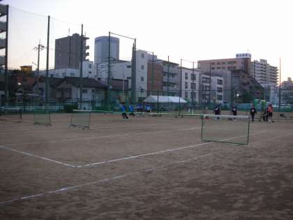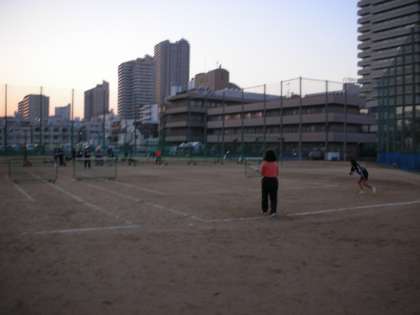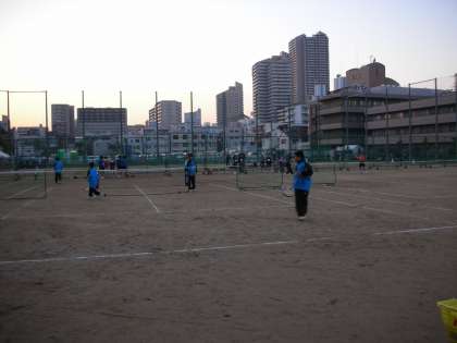 ソフトテニス部は、第二グラウンドで練習をしています。工事中は、第二グラウンドで野球部とテニス部が、半面ずつ使用して練習します。みんな頑張っています。