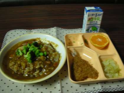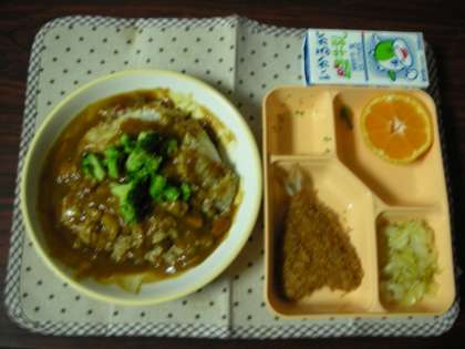 今日は、人気メニューの一つ『チキンカレーライス』です。ブロッコリーを添えていただきます。おかずは、鯵のフライ、キャベツのドレッシングあえ、みかんです。