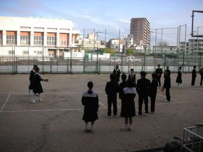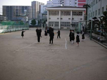 グラウンドでは、男女が仲良く羽子板で遊んでいます。昔の遊びを体験しています。思ったよりも難しいようで、羽根を飛ばしすぎる場面もしばしばありました。