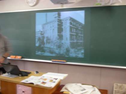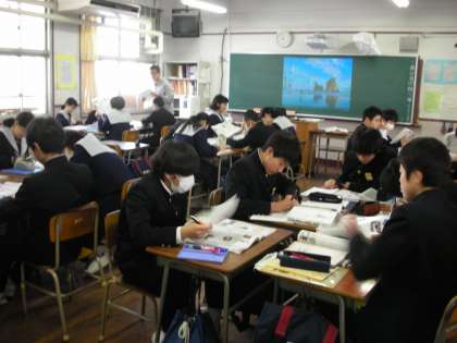 2年生の社会科の授業の様子です。パソコンとプロジェクターを使って、資料となる写真を拡大して、わかりやすい授業を展開しています。