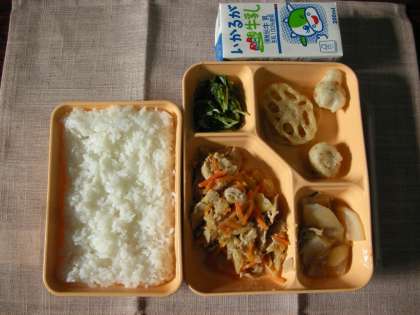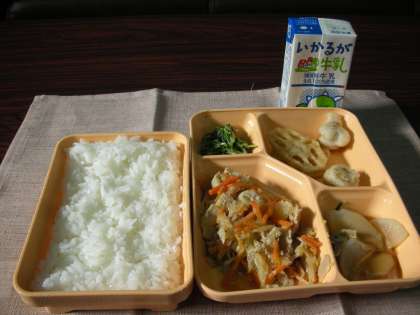今日は、豚肉のしょうが焼き、里芋とレンコンのから揚げ、風呂吹き大根、水菜のおかかあえでした。