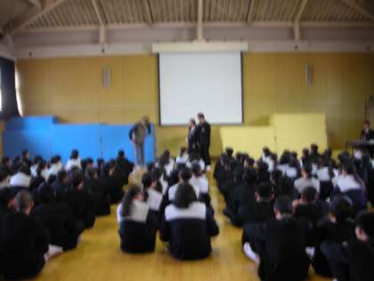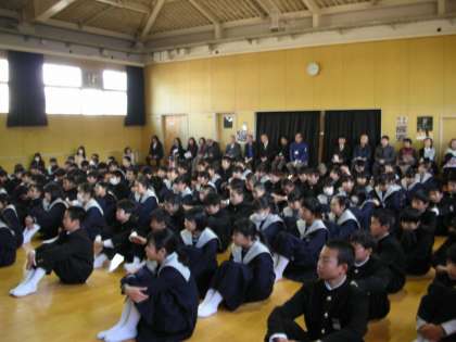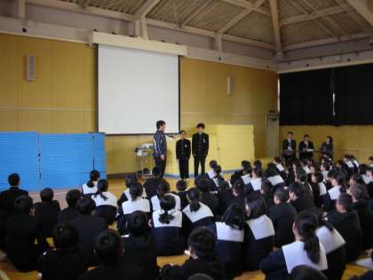 1年生は、5時限目に格技室で保護司会の皆さんが『薬物乱用防止教室』を催してくださいました。保護司の先生から『薬物』についてのお話があり、その後『薬物の恐ろしさを表したDVD』を鑑賞しました。最後に先生が「薬物を人に勧める役割」をし、「各クラスの生徒代表が薬物を勧められる役割」をしました。いわゆる『ロールプレイゲーム』です。生徒たちは、巧みな勧めを見事にかわして断っていました。