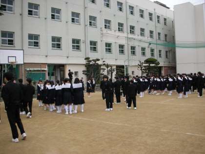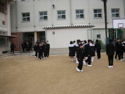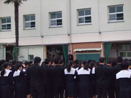 月曜日は、全校集会が行われる日です。生徒たちは、登校後すぐにグラウンドに出てきます。5分前には、整列が完了します。工事の関係で、職員室の方向に向かって整列しています。
