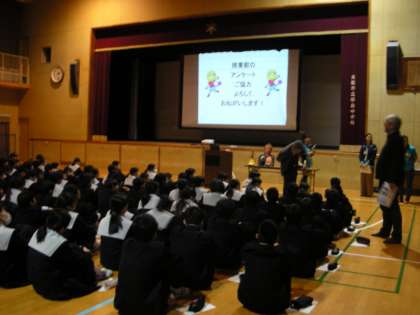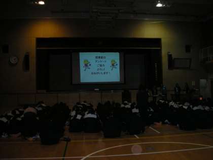 1年生は、6時限目に体育館で喫煙防止教室の取り組みを行いました。都島区保健福祉センターの保健師さんから、『たばこの害に』、様々な角度からお話をいただきました。
