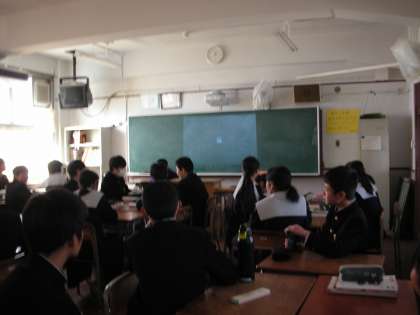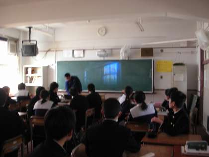 2年生の社会科の授業の様子です。パソコンとプロジェクターを使って、教材を黒板に映しだしています。生徒たちは、一生懸命その映像を見ています。