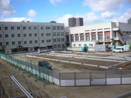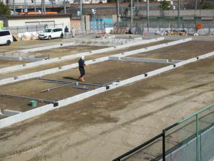 工事は、基礎工事が終わり、整地し各種配管工事が進められています。
