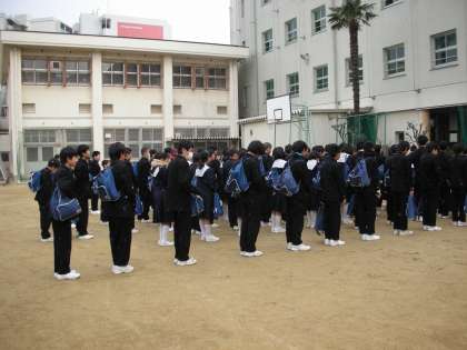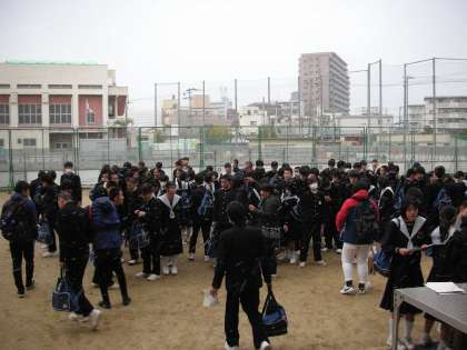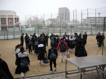 2年生が予定時間より少しだけ遅れて、帰校しました。小雪が舞っています。
