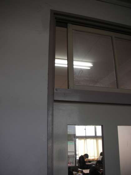 後方の扉の上の窓は、ほんの少し、開いています。これは、空気の換気をするためです。室内が密閉され、空気が乾燥しすぎて、インフルエンザ等のウィルスに感染するのを防ぐ目的で開いています。
