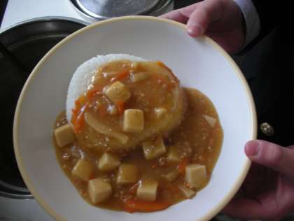 1年生の教室を回っていると、お皿にきれいに盛られたご飯を持っている人がいました。あまりにもきれいなので、写真を撮りました。