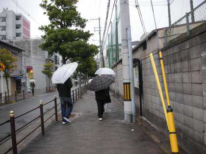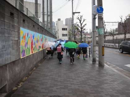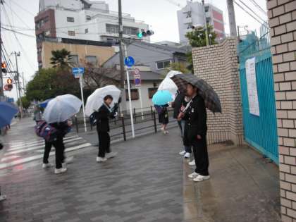 裏門では、1年生の風紀委員の人があいさつ運動をしています。