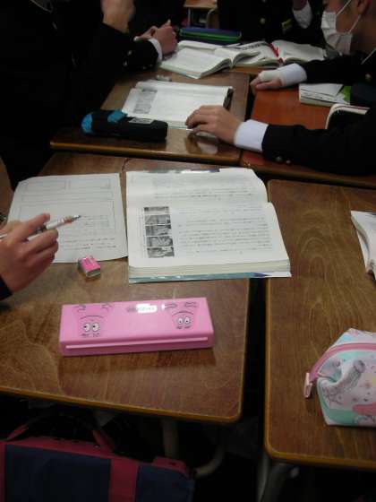 2年生は、班に分かれて学習をしています。話し合って、課題に対する答をまとめています。活発に話し合っています。話し合った結果をプリントにまとめたいます。