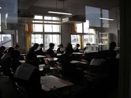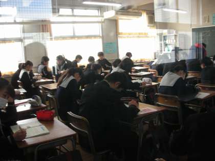 3年生は、受験直前ということで、プリント学習をしている授業が多くなってきました。様々な入試につながる問題が印刷されたプリントを配布され、一生懸命勉強しています。本当に頑張っています。