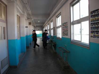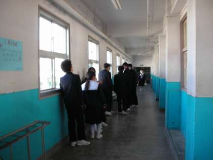 廊下では、ビーフシチューを先生が入れています。給食を食べる人は、並んで待っています。