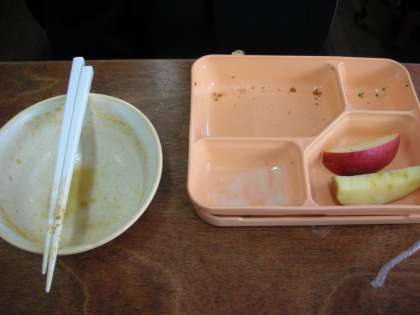 給食を食べ、デザートを食べる直前のようすです。食器は、リンゴ以外完食です。