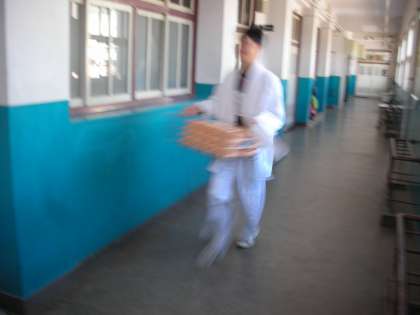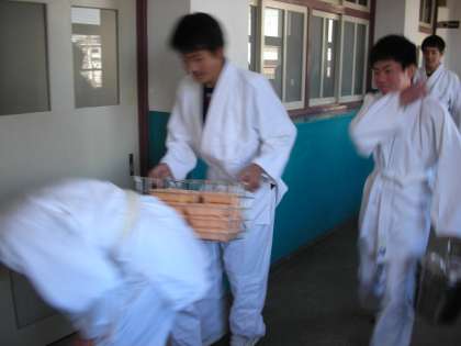 この日は、5時限目に体育の授業で柔道のクラスがありました。柔道着を着て、格技室に移動するときに、返却する食器を持ってきます。柔道着と食器の組み合わせが何とも興味深かったのでカメラで「カシャ!」
